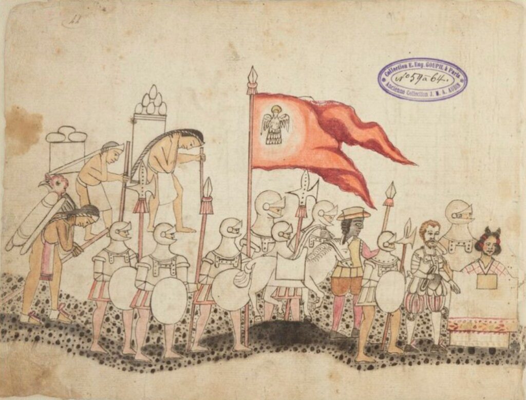 Incluso en fuentes primarias como podría ser el Lienzo de Tlaxcala (ver completo aquí), que hemos conservado únicamente gracias a la copia en color que Manuel de Yllañez realizó en 1773 de la obra original de 1552, en la que el cabildo de Tlaxcala y el virrey Luis de Velasco y Ruiz de Alarcón (Carrión de los Condes, 1511-Ciudad de México, 1564) solicitaban al emperador Carlos V (Gante, 1500-El Escorial, 1558) una mayor indulgencia para con este pueblo dado que originalmente apoyaron a Hernán Cortés en la conquista de los aztecas.