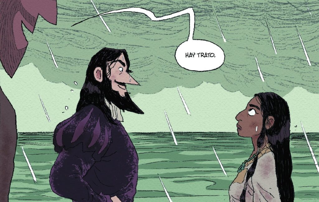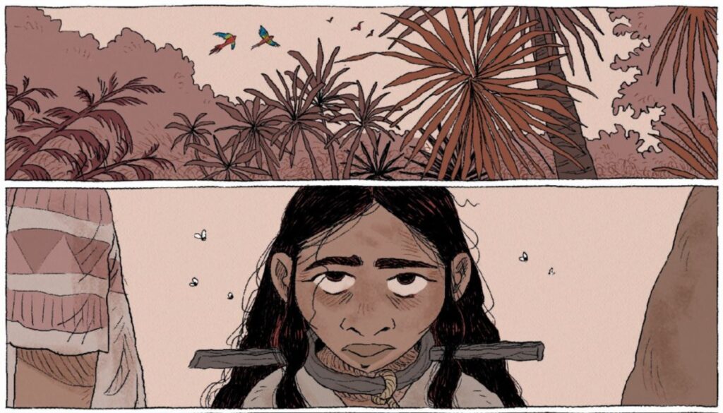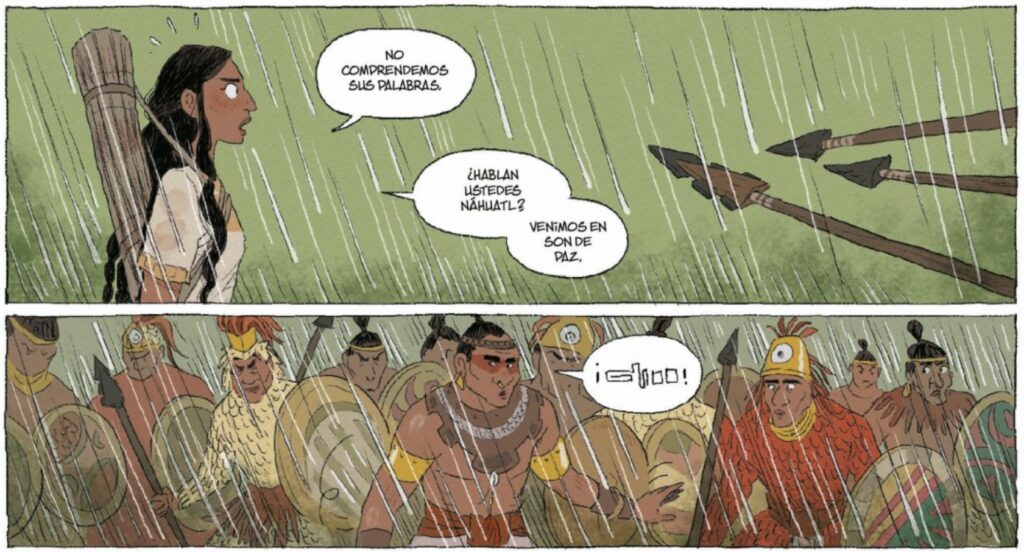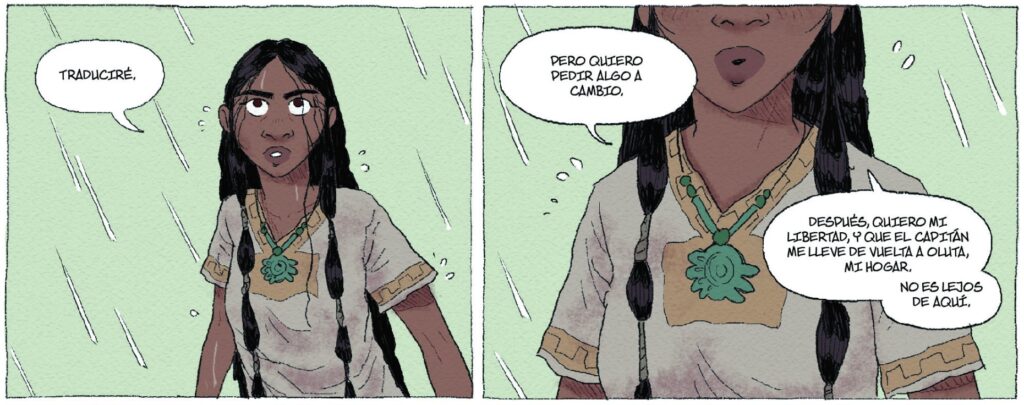 Por todo ello, esta novela gráfica incide más en su labor de utilizar sus conocimientos lingüísticos para evitar mayores atrocidades que la de una colaboradora necesaria en la colonización del México precolombino por parte de los castellanos.