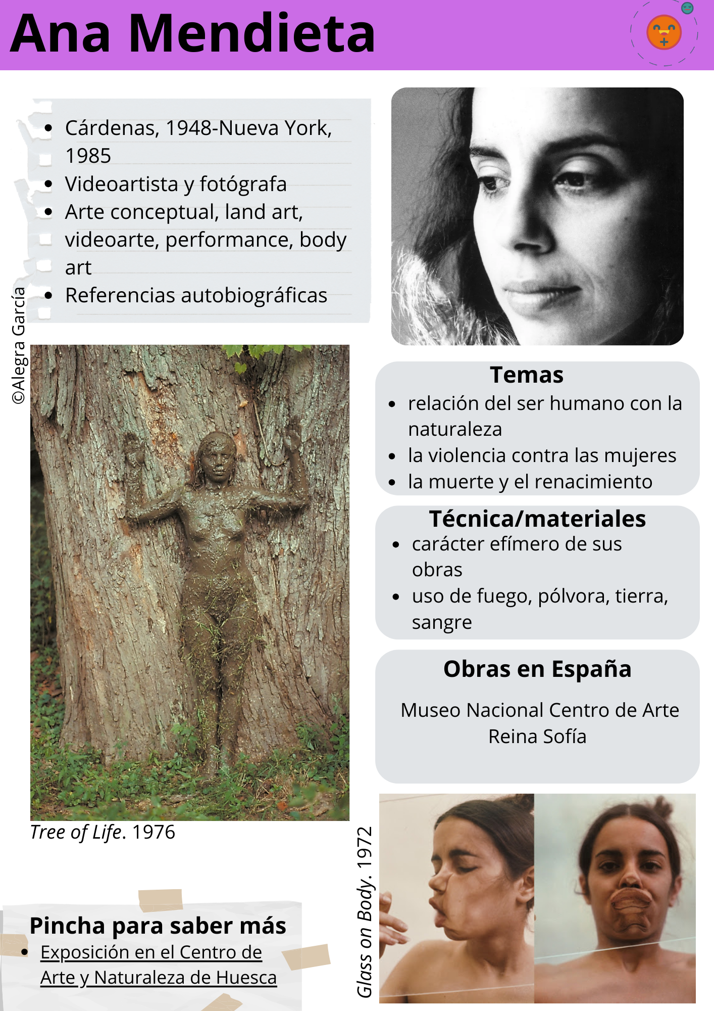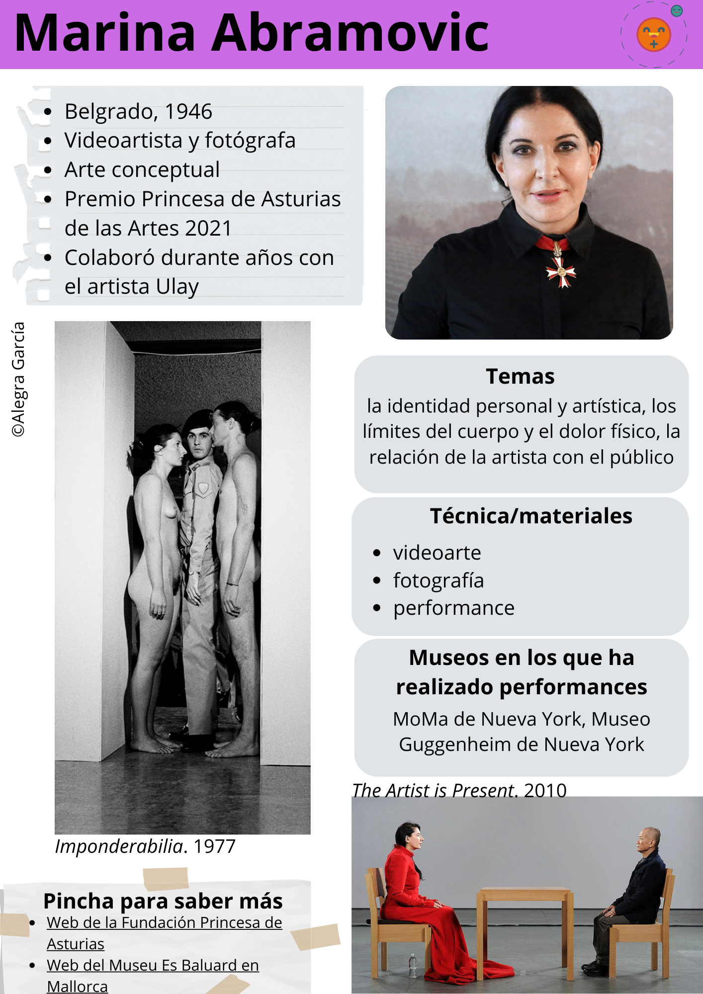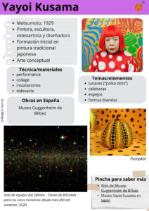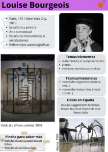 En esta cuarta y última entrega publicamos las fichas correspondientes a las últimas seis artistas incluidas en el currículo de Historia del Arte de 2º de bachillerato de la Comunidad de Madrid. Se trata de artistas que nacieron en el siglo XX y que desarrollaron y todavía desarrollan su actividad en diversos formatos durante este siglo y las primeras décadas del XXI.